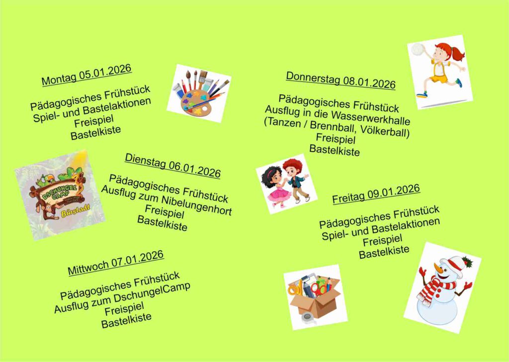 In der Zeit vom 05.01.-09.01.2026erwartet die Kinder ein spannendes Programm mit kreativen, sportlichen und spielerischen Angeboten. Ziel ist es, die Ferienzeit sinnvoll zu gestalten, Gemeinschaft zu fördern und den Kindern viel Freude und Abwechslung zu bieten.